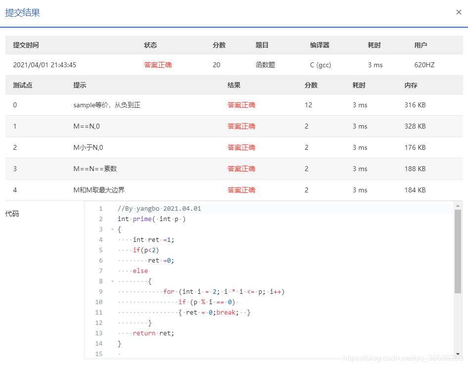 prime当用户传入参数p为素数时返回1,否则返回0;函数PrimeSum返回区间[m, n]内所有素数的和。题目保证用户传入的参数m≤n。#include#include int prime( int p );int PrimeSum( int m, int n );int main(){ int m, n, p; scanf("%d %d", &m, &n); printf("Sum of ( "); for( p=m; p<=n; p++ ) { if( prime(p) != 0 ) printf("%d ", p); } printf(") = %d\n", PrimeSum(m, n)); return 0;}/* 你的代码将被嵌在这里 */